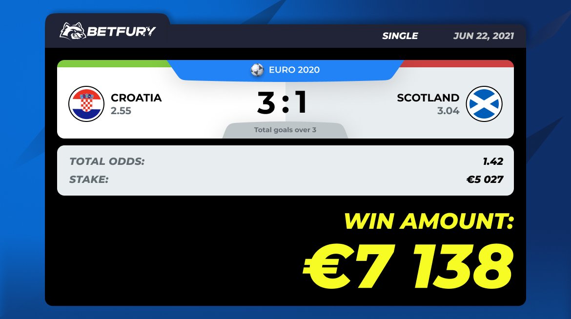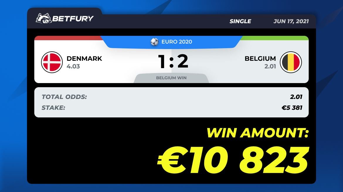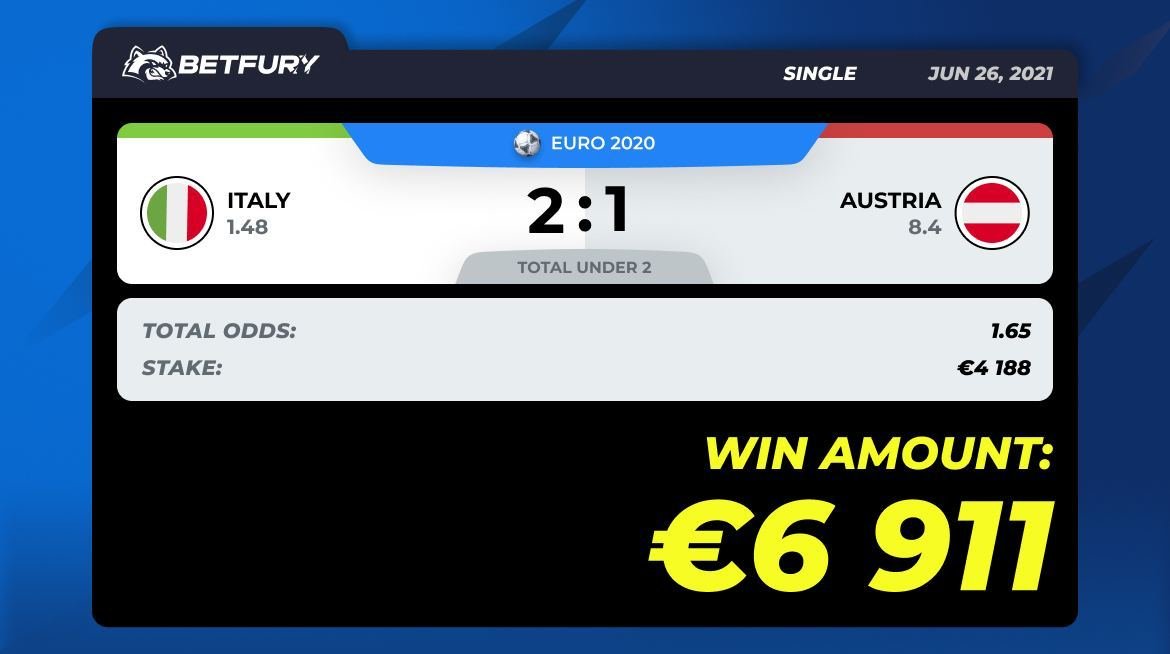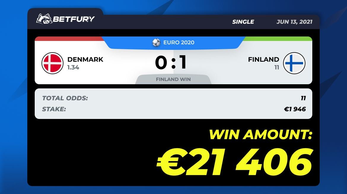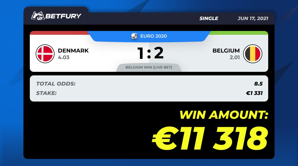BetFury Sports Betting started with EURO 2020 and on the second day of the EURO 2020 group stage User215405 has made an insane Big Win with multiplier 11! It is the biggest win of June and a perfect story about braveness, sport and a little bit of luck.